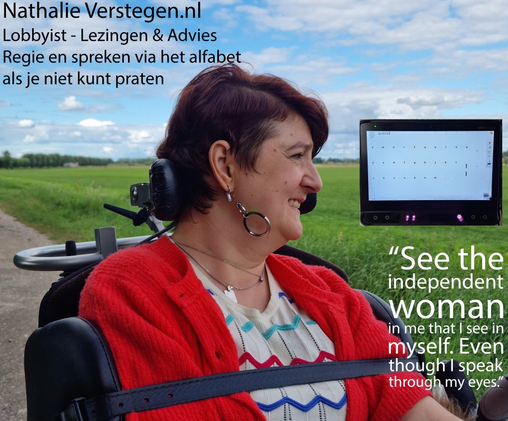 Door een lichamelijke beperking (CP) zit ik in een rolstoel en heb ik geen spraakvermogen. Mijn beperking is puur fysiek. Ik communiceer met mijn ogen en mimiek. Daarnaast maak ik ook gebruik van een spraakcomputer, die ik met mijn ogen bedien.