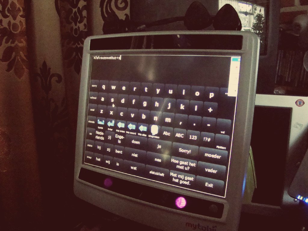 Door middel van camera’s in de computer wordt geregistreerd waar men heen kijkt, en door op het beeldscherm naar een letter te kijken wordt deze geselecteerd en op deze manier kan ik zinnen formuleren.